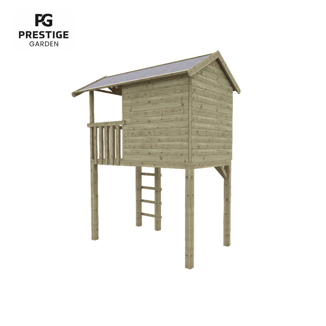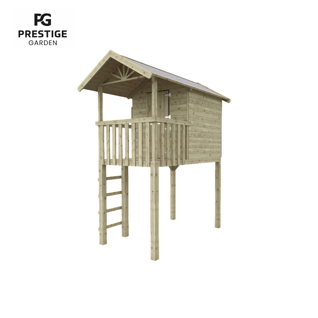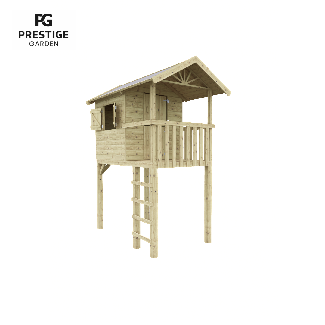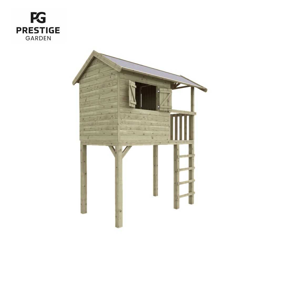 Prestige Garden vous présente la maisonnette en bois : Treehut. Treehut est une aire de jeux semblable à une cabane dans les arbres qui représente des heures de plaisir. La maisonnette en bois est fabriquée en bois de pin imprégné, ce qui garantit une durée de vie plus longue du matériau. La maisonnette a un escalier droit, une porte en deux parties et des volets ludiques. Le panneau avec les volets peut être placé sur le côté gauche ou droit. En fonction de ce qui convient le mieux à votre jardin. Un espace supplémentaire a été créé au niveau des trappes et de la porte, afin que les doigts ne puissent pas être pincés. Cette maisonnette amusante peut être agrandie avec : un toboggan, une balançoire supplémentaire, une boîte aux lettres, un téléphone ou d’autres accessoires. Cette maisonnette est livrée avec des murs pré-assemblés, ce qui la rend considérablement plus facile à assembler.