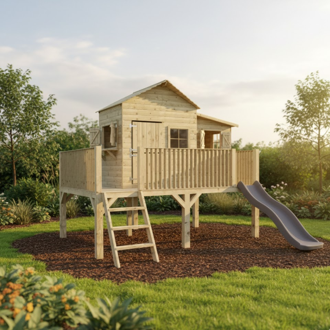 • Aire de jeux extra-large grâce à l’extension et au palier généreux de 90 cm de haut avec véranda.
