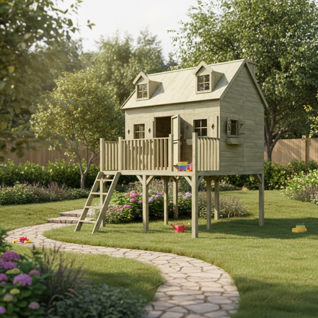 Vous êtes à la recherche d’une maisonnette très spéciale et unique pour votre enfant ? Alors le playhouse Madrid est définitivement recommandé. En fait, les images dis-les trop. Il s’agit d’une maison recréée de manière réaliste, qui stimule encore plus votre enfant dans son jeu de simulation. La porte double, les pièces de fascia extra larges, les volets, les bacs à fleurs et même 2 lucarnes complètent le tableau. Ce qui rend cette maison doublement spéciale, c’est qu’elle dispose d’un grenier avec un escalier. Les quatre fenêtres fixes sont équipées de plexiglas. Comme la maison est sur une plate-forme, l’aire de jeux peut être utilisée de manière supplémentaire et un bac à sable peut être fabriqué sous la maison, par exemple. Pour compléter la maison, une balançoire, un toboggan ou d’autres accessoires supplémentaires peuvent être commandés. En raison des ouvertures plus larges au niveau de la porte, une sécurité supplémentaire est intégrée pour les doigts, qui ne peuvent pas être pincés. La maison est livrée avec des murs pré-assemblés, ce qui facilite l’assemblage. Manuel et fournitures de montage inclus. Pour protéger les poteaux, nous vous recommandons de commander des points de poteau (9×9). Attention : livré sans feutre de toiture ! C’est facile à commander. Spécifications